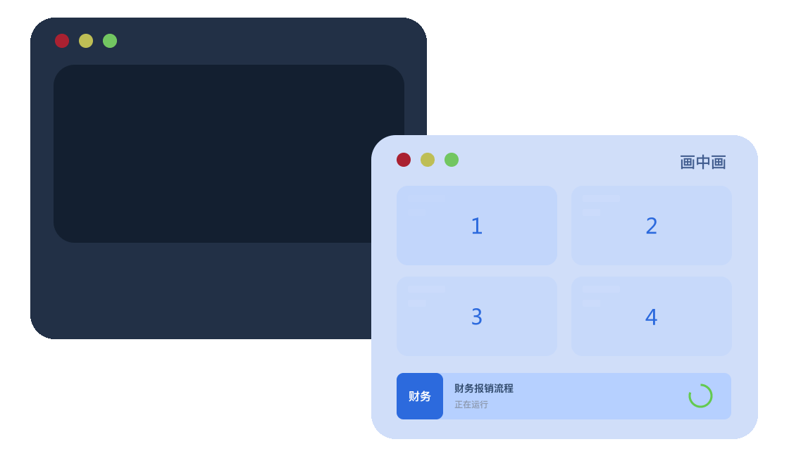 前台机器人支持画中画运行,个人办公和流程运行同时进行互不干扰,把流程在放本机电脑 的另一个会话中执行,用户可以在本地电脑主会话上继续工作,进一步提高工作效率