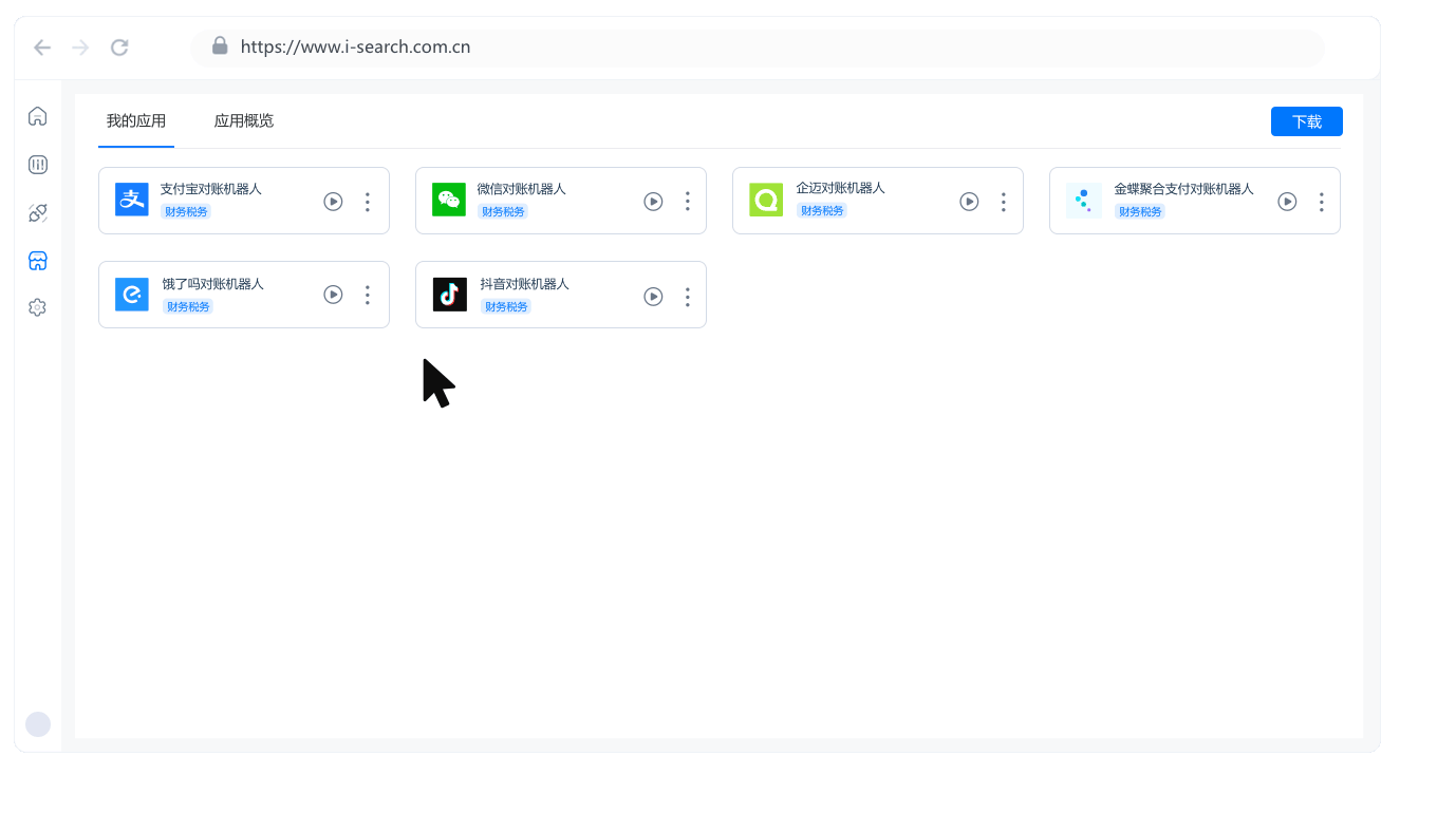 RPA应用商城是指艺赛旗供应Robotics Process Automatic(RPA)开箱即用的应用软件,可提供用户浏览、购买、下载和安装各种RPA相关应用程序和工具的在线平台。艺赛旗RPA商城旨在为RPA用户提供一个集中查询和获取应用的的平台,全方面覆盖各种场景和行业,如财务、人力资源、金融、保险、运营等,为用户提供多元化的自动化解决方案;用户可轻松浏览,并选择合适他们业务需求的应用,通过一键申请试用或购买享受开箱即用的便捷体验。通过获取和集成RPA应用,即可开启自动化流程之旅。